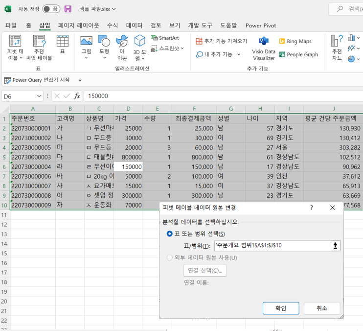 ▲위의 사진은 데이터를 표로 변환하여 피벗테이블 데이터 원본으로 설정한 상태입니다. 표가 피벗테이블 데이터 원본일 때는 위의 사진처럼 표의 이름이 나타납니다.