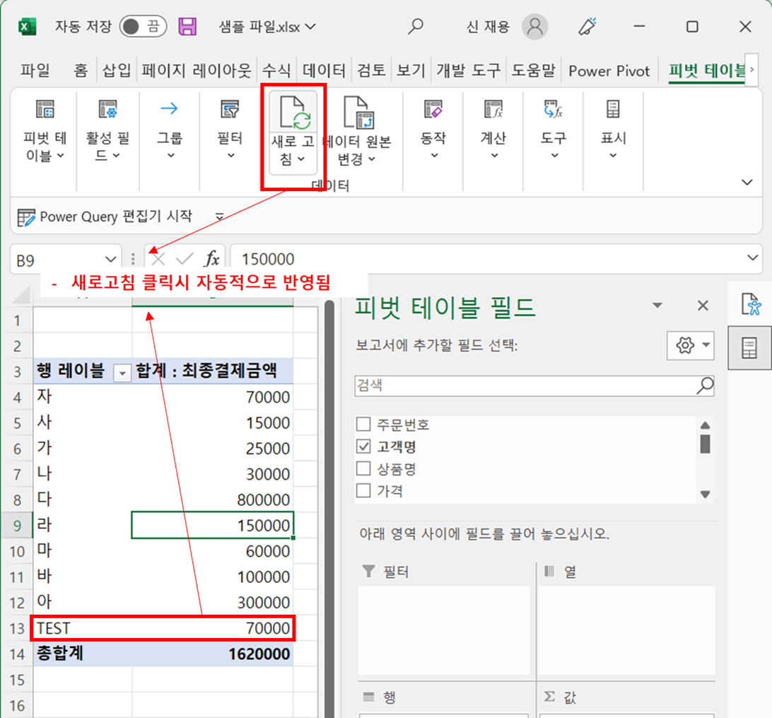 ▲피벗테이블의 데이터원본이 표일 때는 데이터가 추가되어도 피벗테이블을 새로고침만 한다면 자동적으로 반영됩니다. 이는 행이나 열을 추가하면 표의 범위가 자동적으로 확장되는 표의 특성 때문입니다.